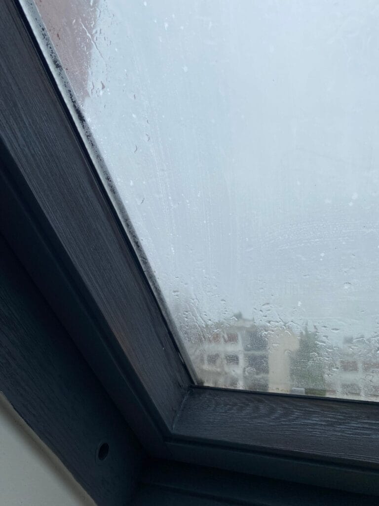 Lorsque la personne prend sa douche, de l’humidité stagne en abondance dans la pièce (>80%): de la buée et des gouttelettes se forment sur la vitre de la fenêtre.
